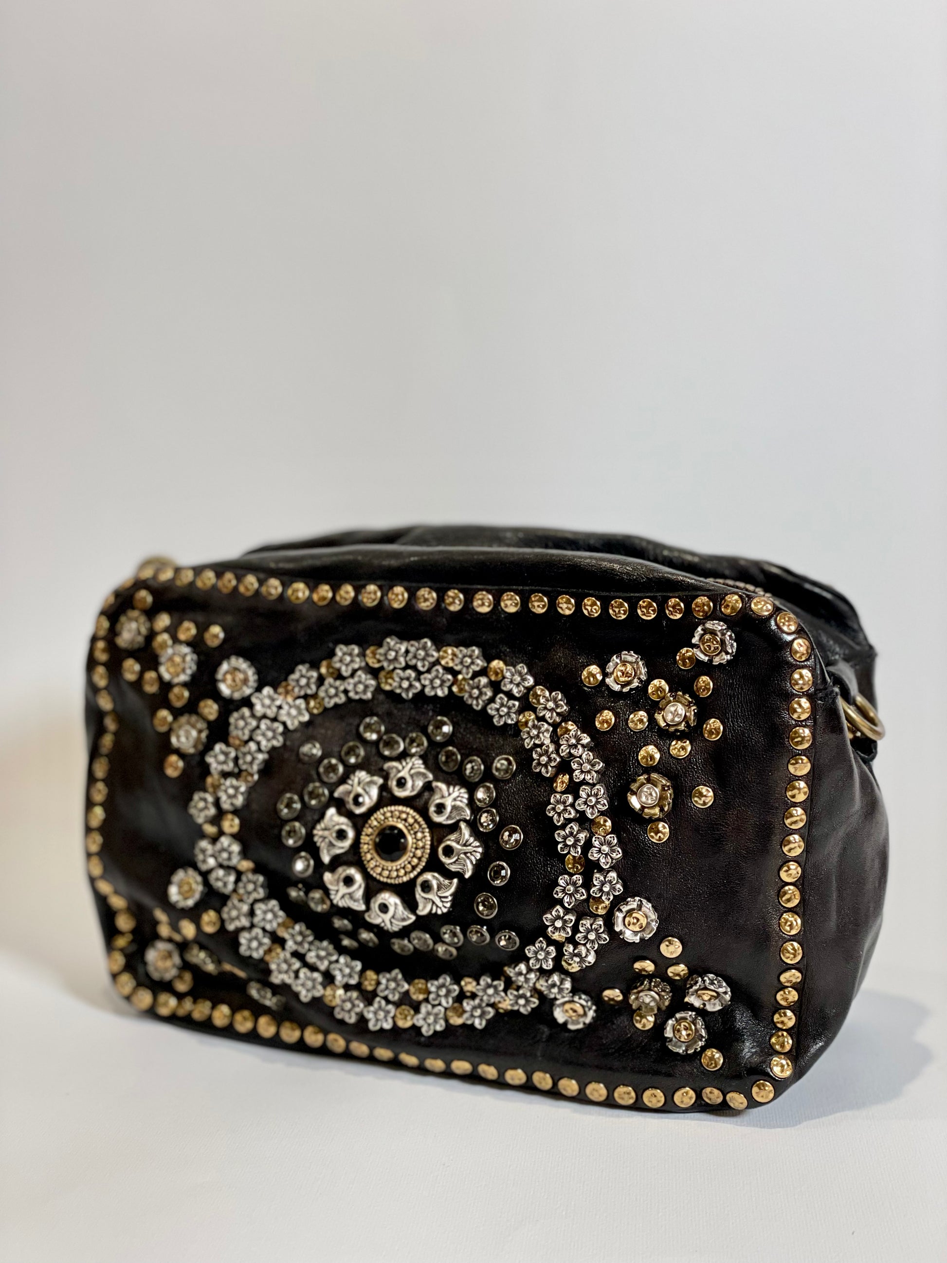 Borsa camera bag Moira in pelle di vacchetta tinta in capo con borchie