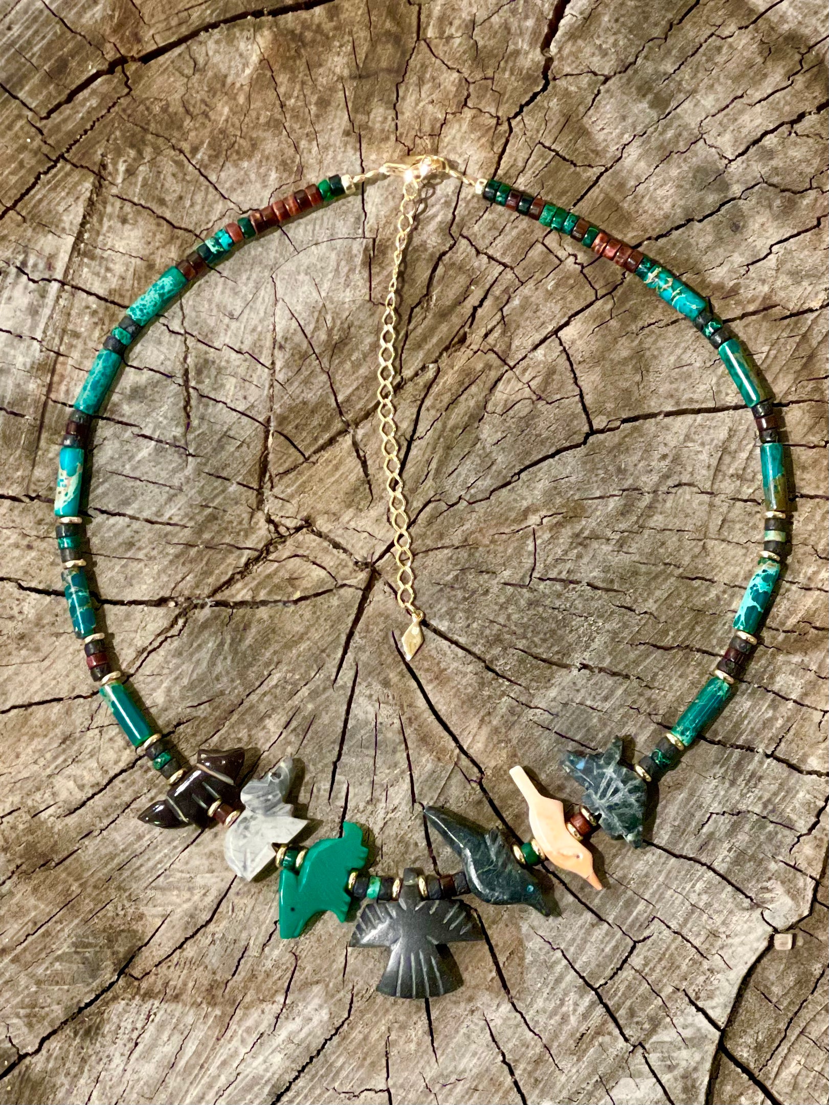Realizzata con preziosi amuleti a forma di animale (lapislazzuli, turchese, diaspro...) e perline placcati d'oro.
