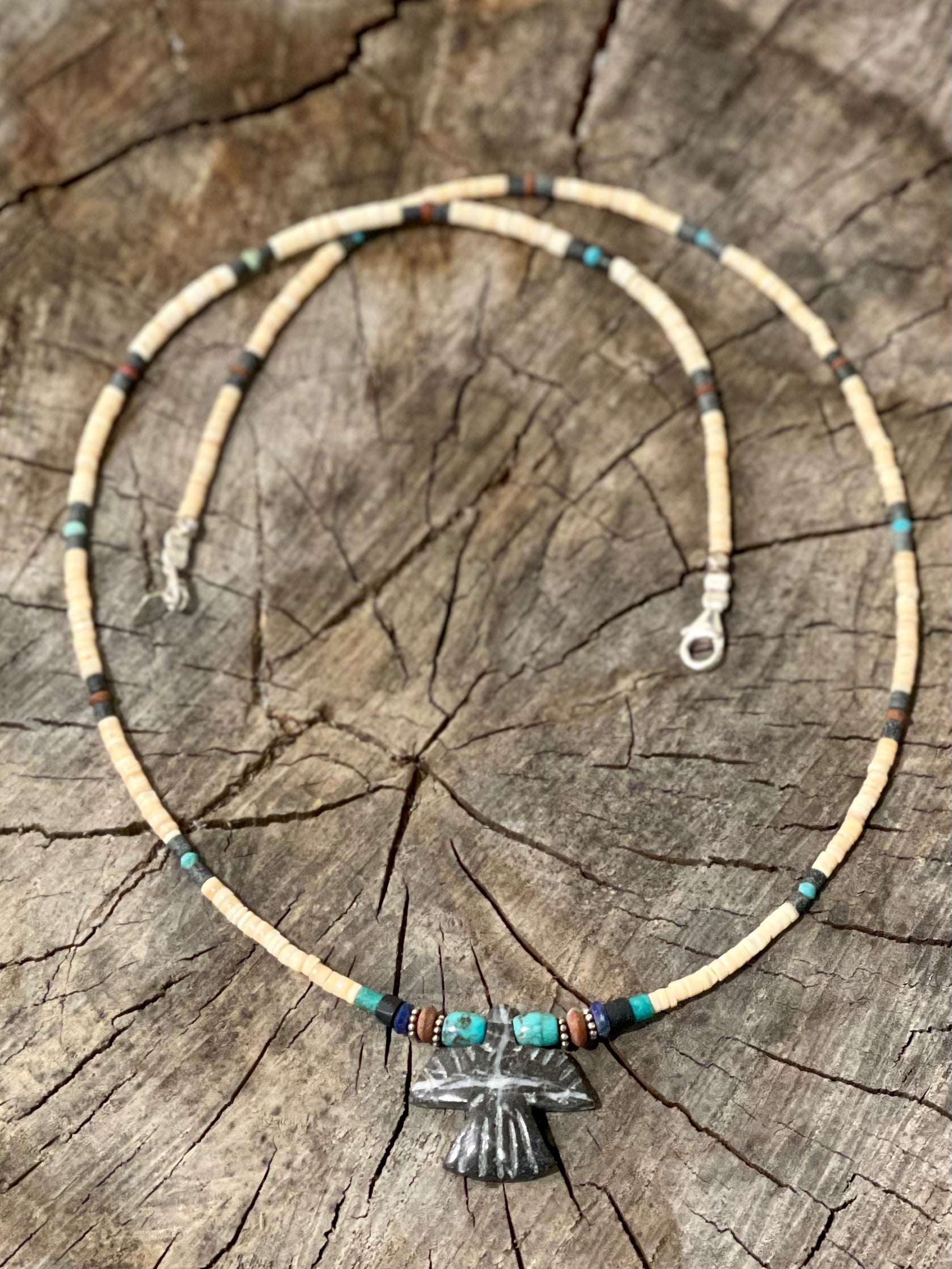 Collana in turchese , conchiglie, giada e lapislazzuli, amuleto aquila in onice ,chiusura argento.