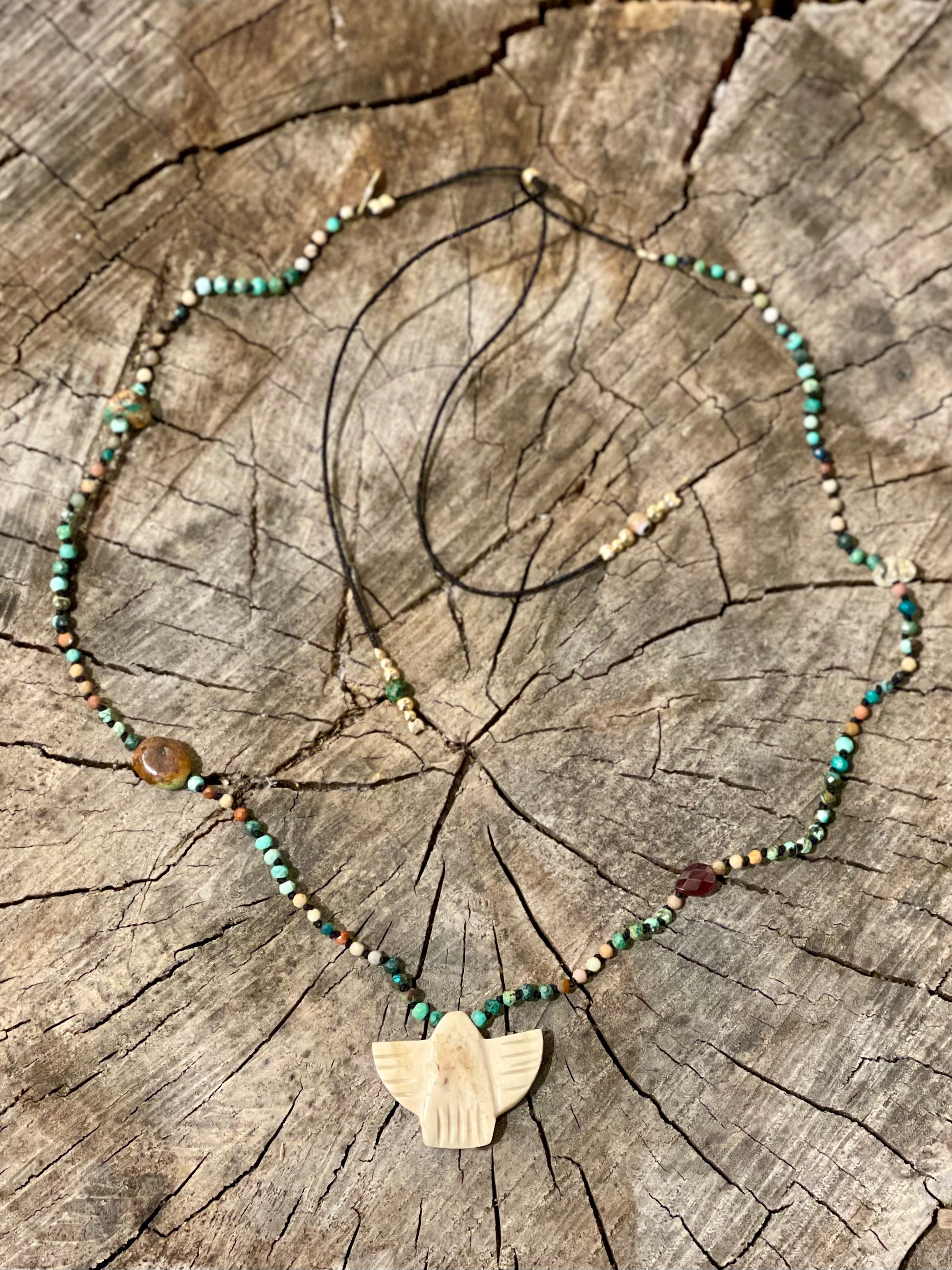 Collana in pietre dure sfaccettate, perline placcate oro 18Kt,amuleto aquila in corno